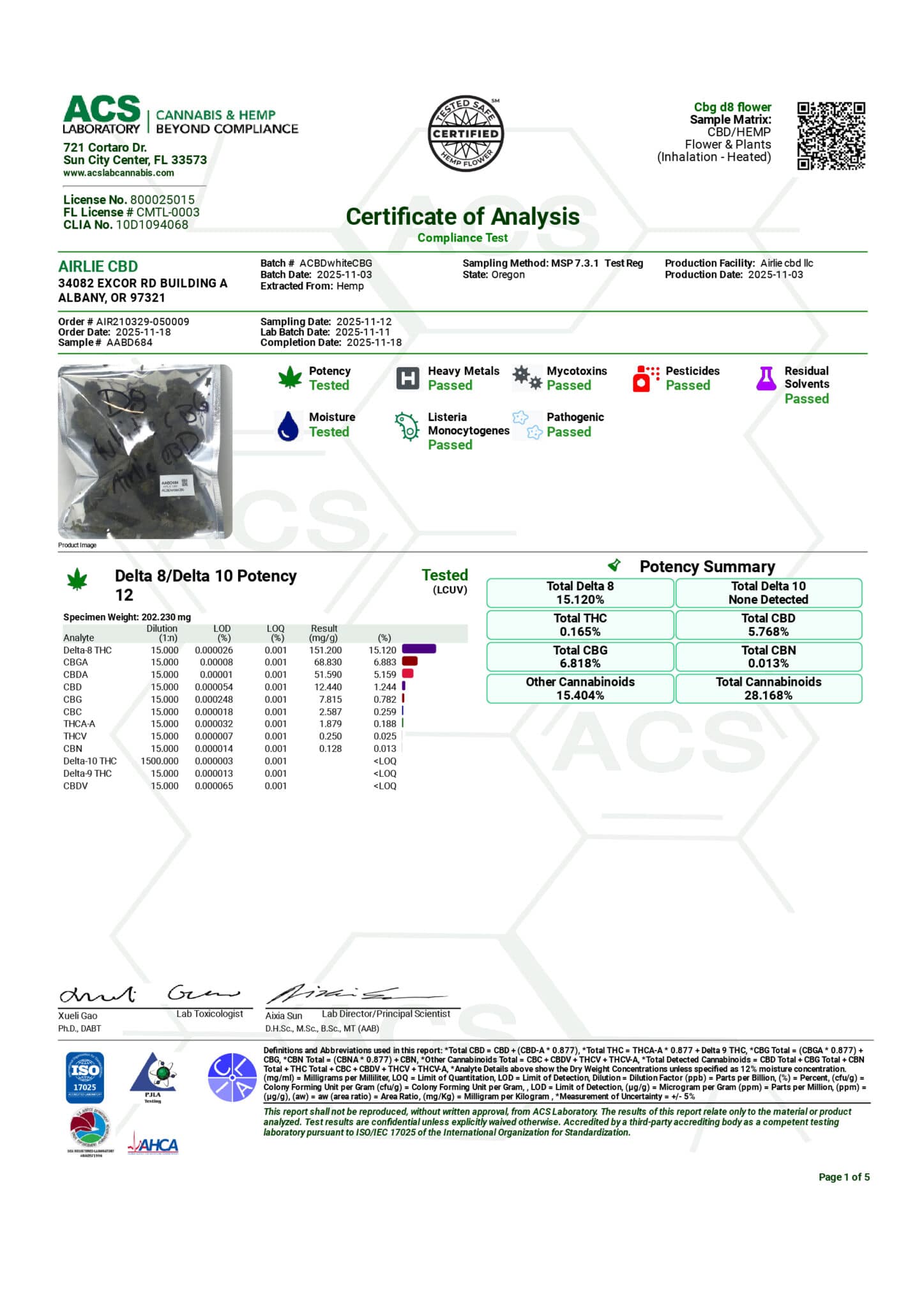 All our Delta-8 Products undergo third-party testing by leading testing agencies like CanMedLabs and Kaycha Labs. Each lab report verifies our D8 products are void of harmful particulates and measure the potency levels to ensure they match (or exceed) what we advertise. The facilities we utilize to perform our extractions and bottling have all earned the GMP seal for operational cleanliness and safety.